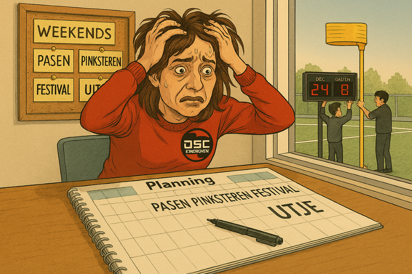 Medewerker van de maand? Jasper van Heuven. Samen met zoon Tim chefte hij eigenhandig het sinds vorige zomer dienst weigerende scorebord van DSC Eindhoven. Menig ingenieur met kernfysische achtergrond had daar inmiddels het hoofd over gebroken. Zonder resultaat. Het scorebord stond al op de nominatie om vervangen te worden. Een hoofdpijndossier voor onze penningmeester. Niet goedkoop, die krengen. Totdat Jasper en Tim op het lumineuze idee kwamen om iets dat draadloos niet meer werkt, gewoon te verbinden met een draadje. Het zijn van die momenten dat ik me realiseer dat ik vroeger op school toch beter had moeten opletten.